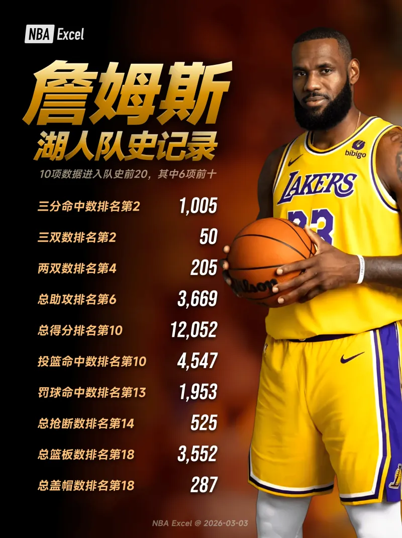 这是詹姆斯加入湖人的第8个赛季,一共为湖人出战了461场比赛,到底交出了怎样的数据答卷?看看他在湖人队史上的真实排名,一目了然: