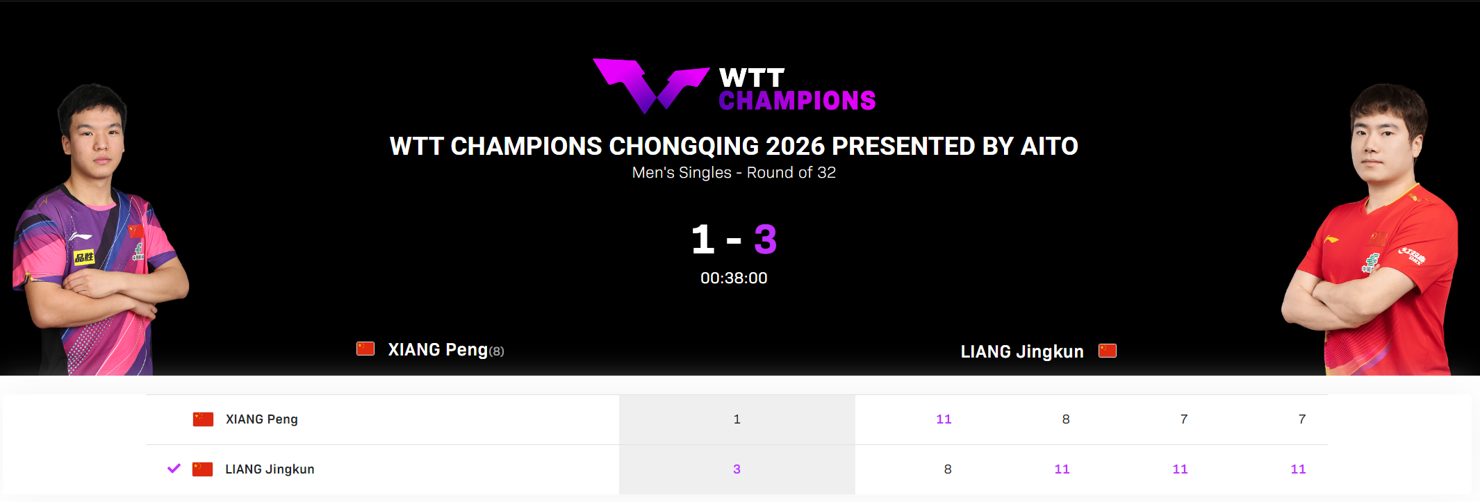 为什么说这场比赛是爆冷呢?29岁的梁靖崑世界排名已经跌至第13位,而23岁的向鹏世界排名是第九,最终梁靖崑是3-1淘汰向鹏这就是爆冷,四局比分:【8-11,11-8,11-8,11-7】,大胖还是在0-1落后的情况下完成大逆转。