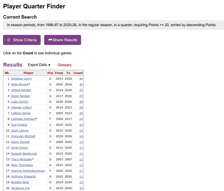 以下是NBA历史单节得分20+次数排名前二十的球员榜单:
