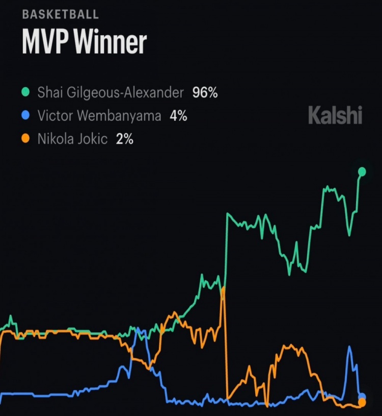 4月7日讯 今天,平台更新了本赛季常规赛MVP的概率,亚历山大上升至96%,文班亚马4%,约基奇2%。